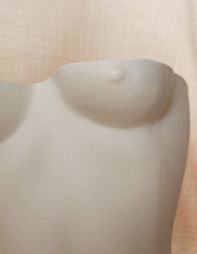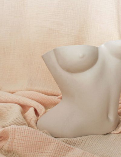 Escultura cerámica en forma de torso femenino que celebra la feminidad con un toque desenfadado y humorístico. Esta pieza rinde homenaje al cuerpo de la mujer a través de una representación divertida y elegante, invitando al espectador a apreciar la belleza y naturalidad de las formas femeninas en un estilo lúdico y contemporáneo.