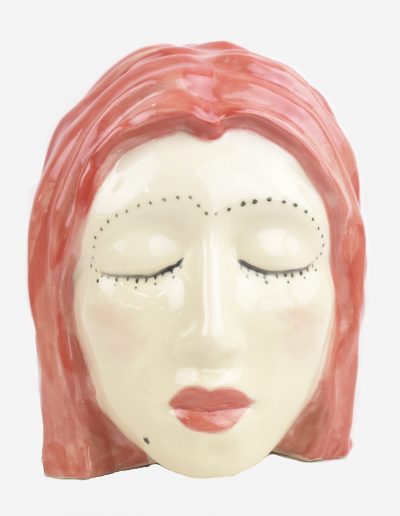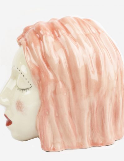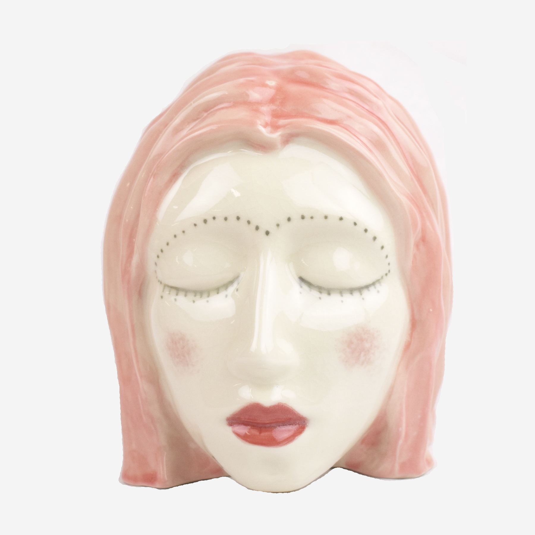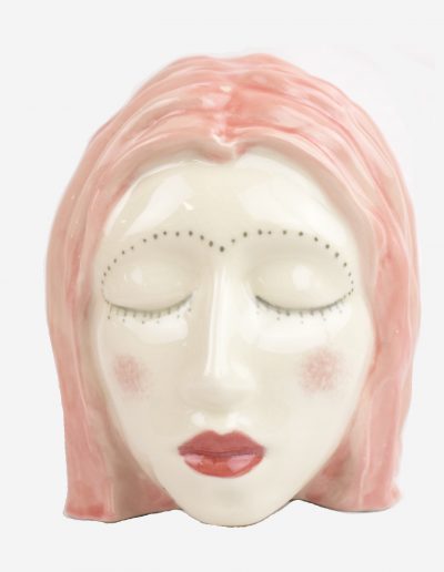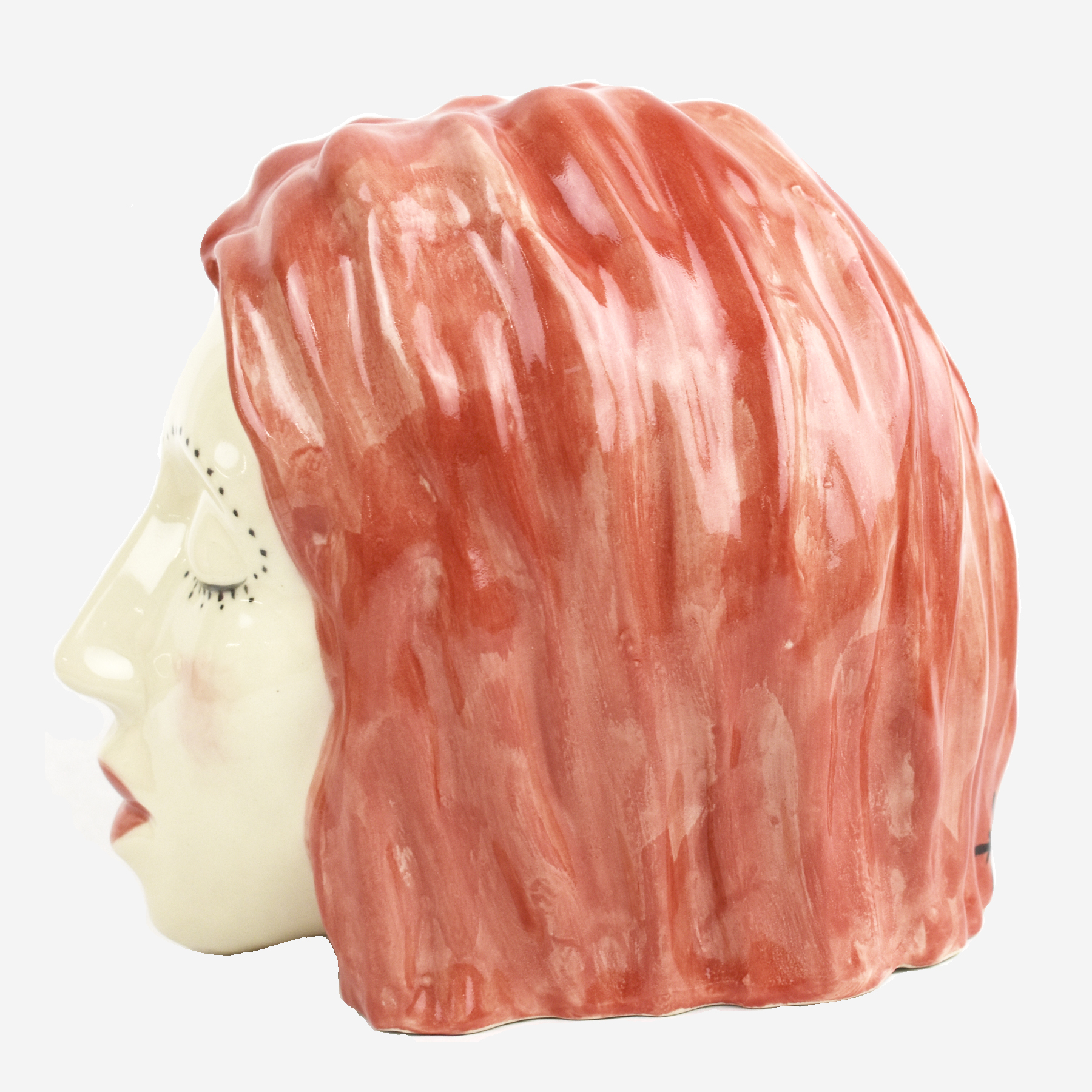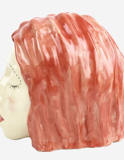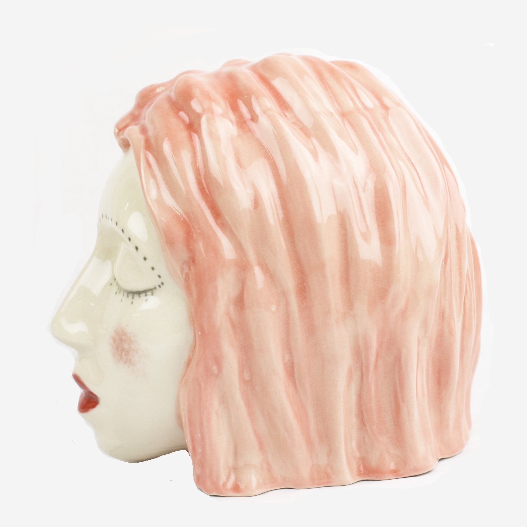 Sculpture in the shape of a female head, with hair decorated either in pink or red, made of porcelain