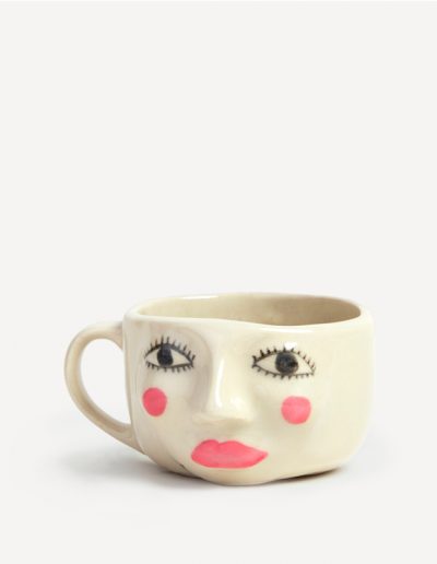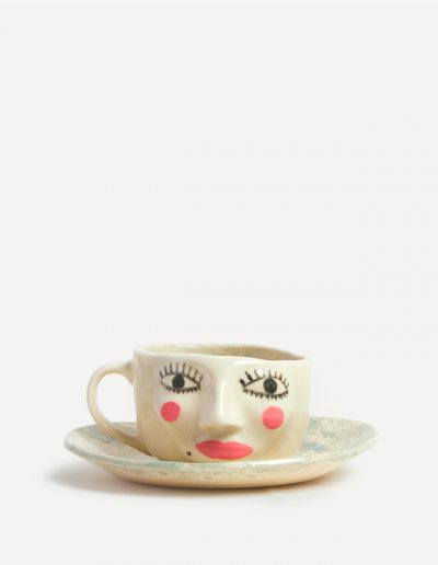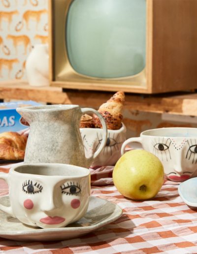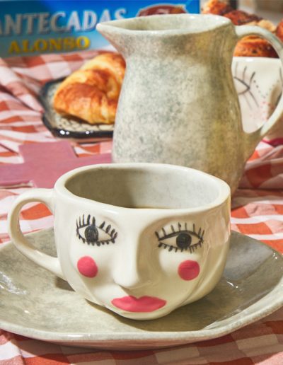 El juego de café está compuesto por seis taza con forma de cara, seis platos y una jarra. La capacidad aproximada de la taza es de 350ml. Las medidas aproximadas son de 10 cm de diámetro, 14 cm de ancho incluyendo el asa y 8 cm de altura, siendo todas las medidas aproximadas.