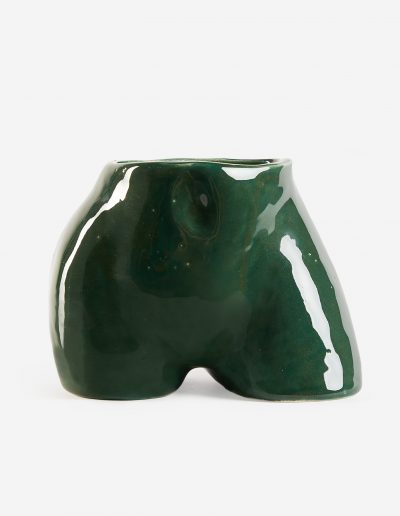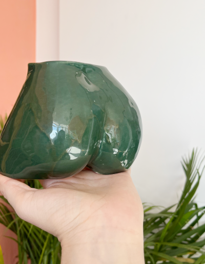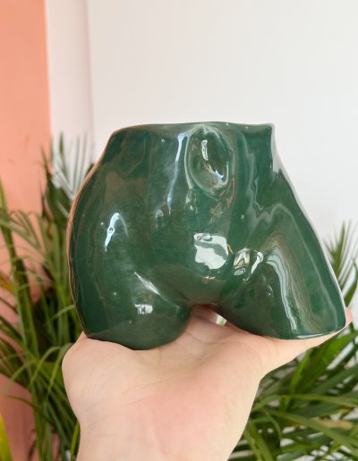 Small handmade ceramic sculpture in the shape of feminine glutes made of the highest quality stoneware decorated in green